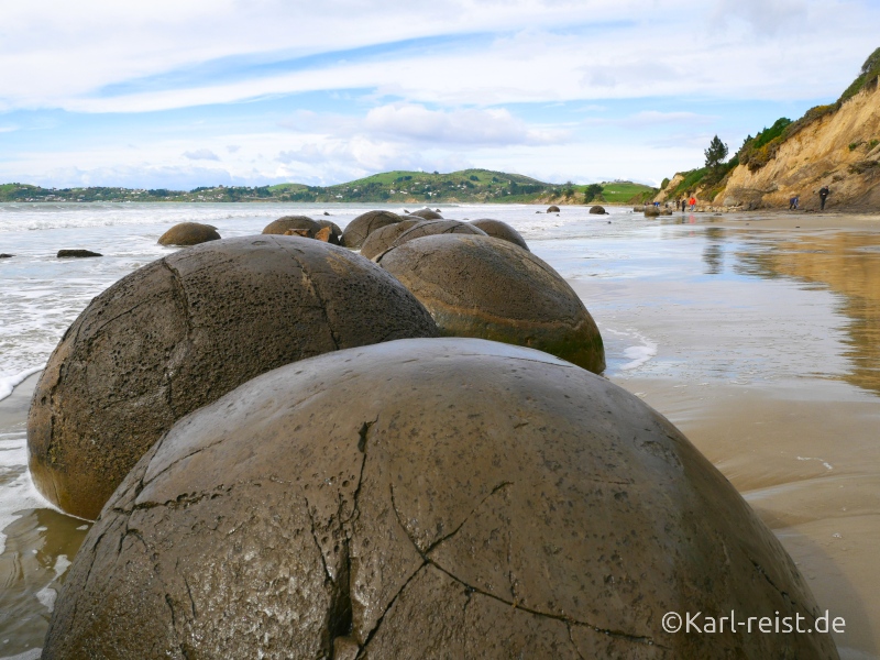 Und etwa 12 Meilen südlich von den Moeraki Boulders gibt es die „Katiki Boulders“. Diese sind nicht alle rund, sondern auch scheibenförmig oder oval. Besonders ist hier, dass diese teilweise Knochen von Sauriern enthalten.