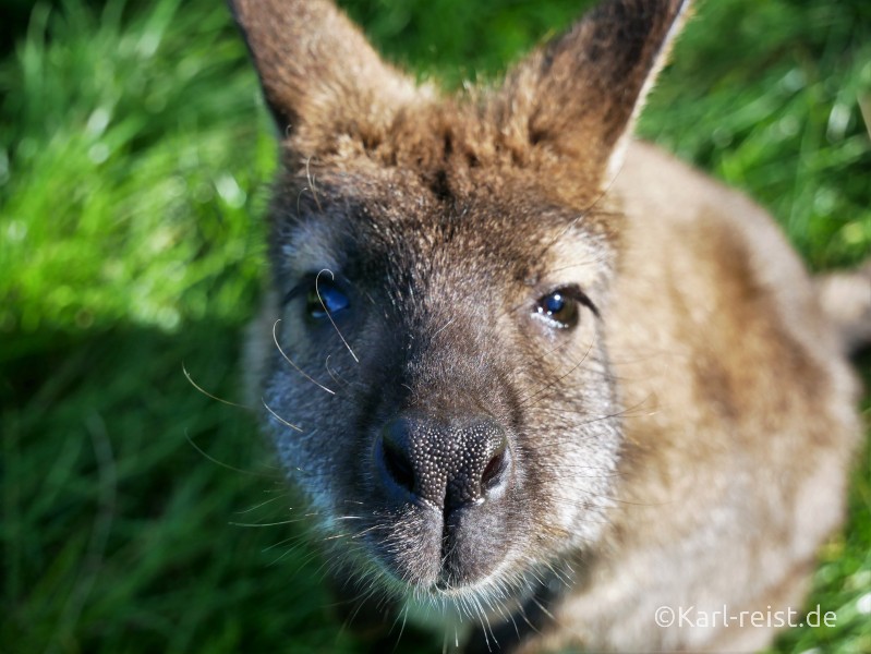 Und schon ging es los. Wir betraten das erste Gehege, hockten uns hin und im Nullkommanichts setzen sich einige Wallabys um uns und aßen geduldig das angebotene Futter. Es war so niedlich. Die Tiere waren sehr zutraulich und teilweise stützten sie sich mit ihren Händen (nein, natürlich Pfoten) auf uns ab. Karl war auch nicht bange und fütterte fleißigen die niedlichen Wallabys.